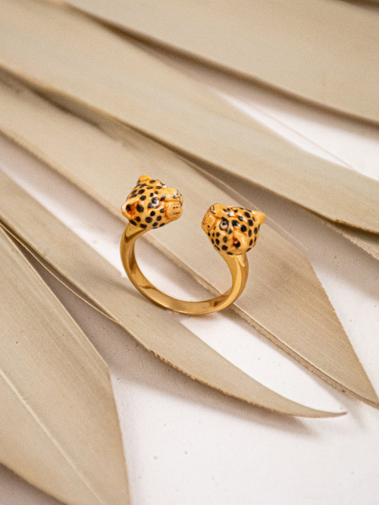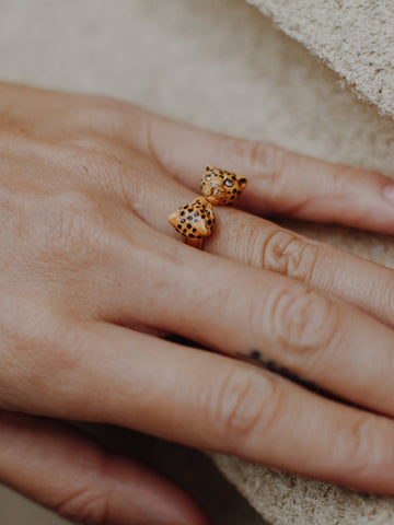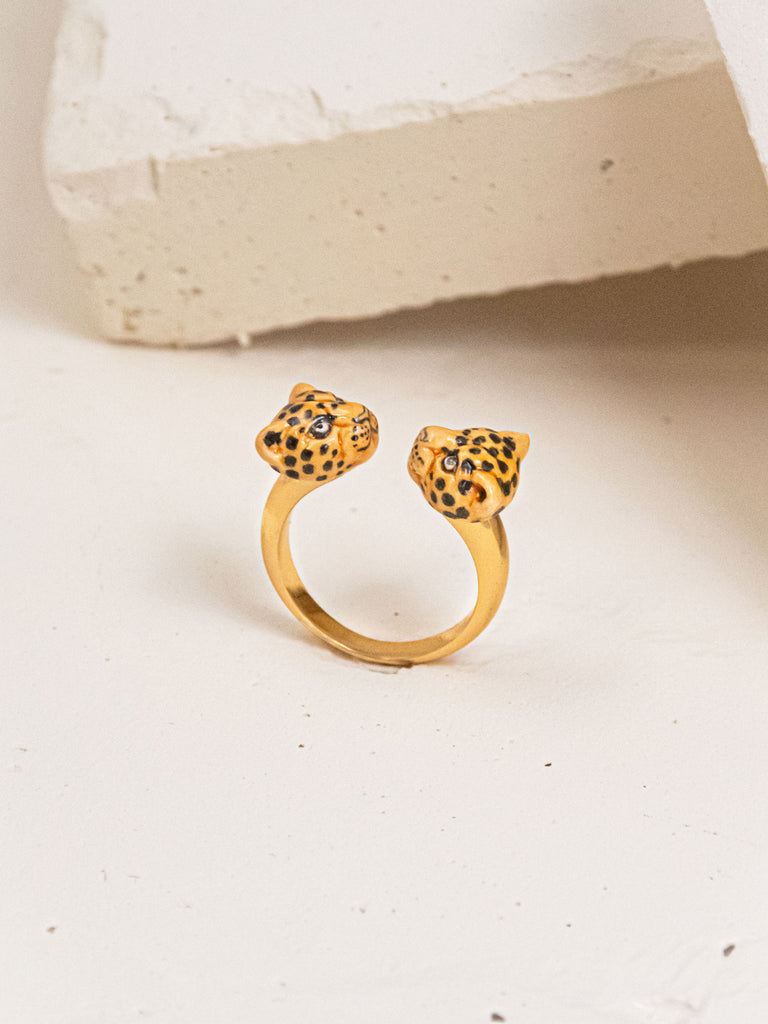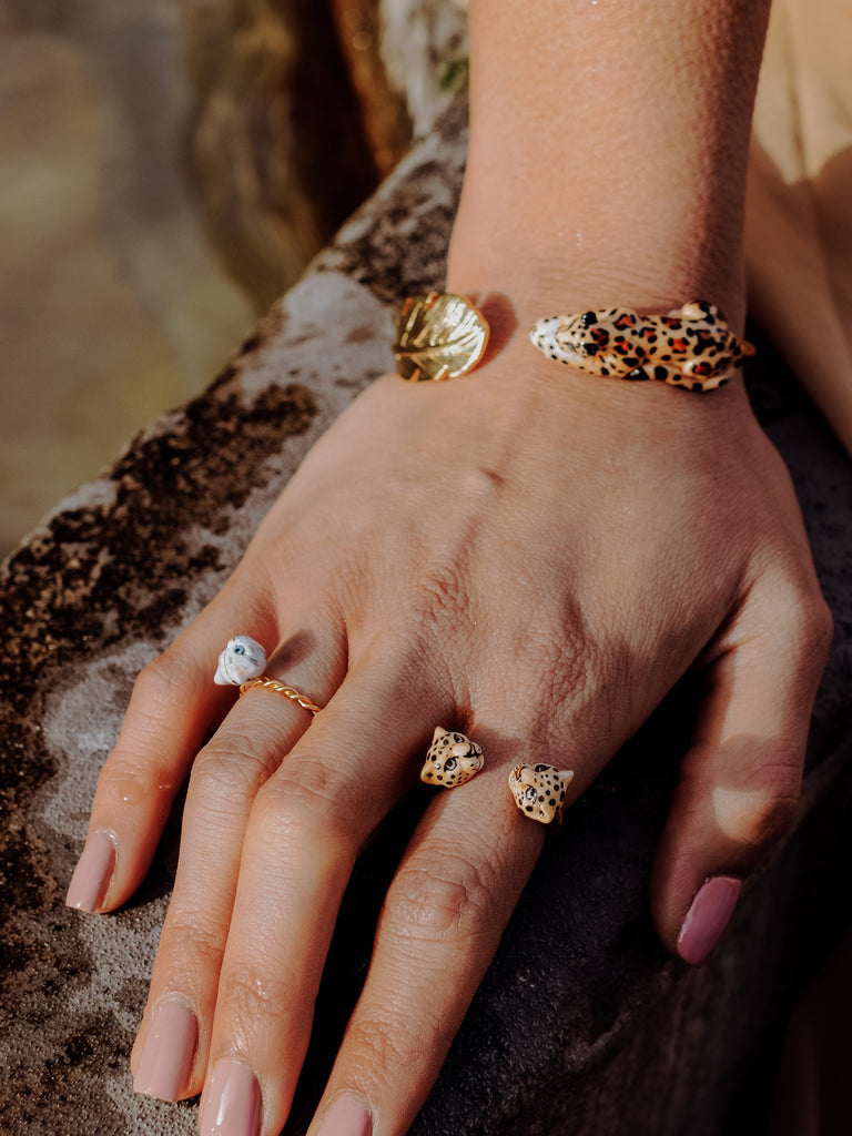 Bague ajustable en porcelaine et laiton doré à l’or fin 18 carats.