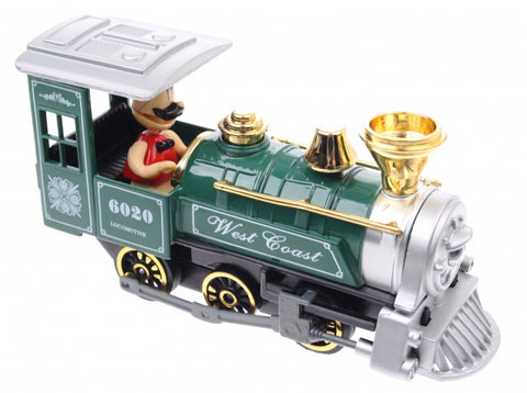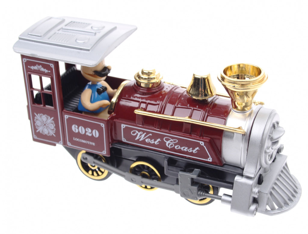 Belle locomotive classique en métal. La locomotive est équipée d'un moteur de rétraction et mesure 15 cm de long. Tirez le véhicule sur une surface aussi loin que possible et relâchez-le. Après cela, la locomotive se mettra à rouler automatiquement. Pendant la conduite, la locomotive fait également du bruit et peut allumer ses feux. (au moyen de piles boutons : 2 incluses)