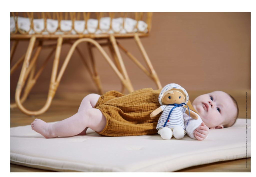 Facilement reconnaissable grâce à sa chevelure blonde et ses rayures contrastées, Eli est facile à saisir par les petites mains. Élégante, avec son petit look de marin, la poupée Eli est composée de micro-velours très doux et de mousseline de coton. Le rembourrage présent à l'intérieur de cette poupée pour bébé est en polyester recyclé certifié GRS. Lavable en machine en cycle doux, cette poupée doudou est du plus bel effet dans sa boîte. Idéale pour un cadeau de naissance ou pour offrir l'ami(e) d'une vie à bébé.