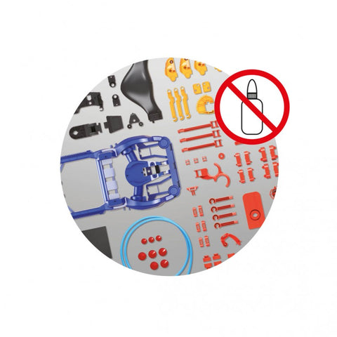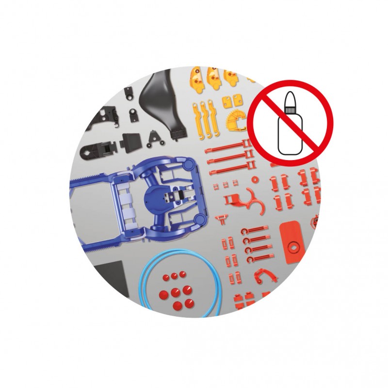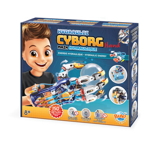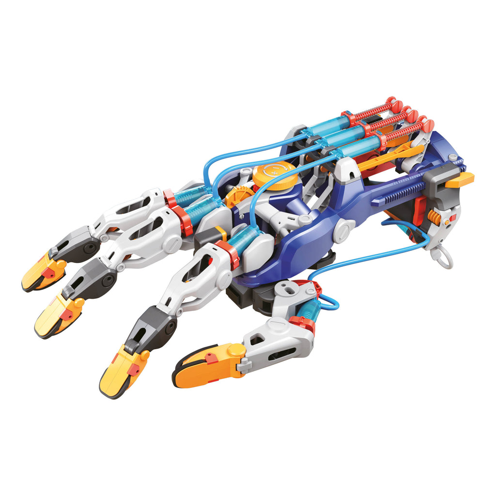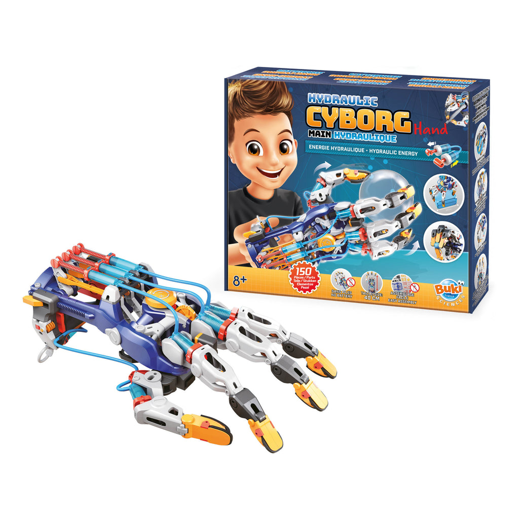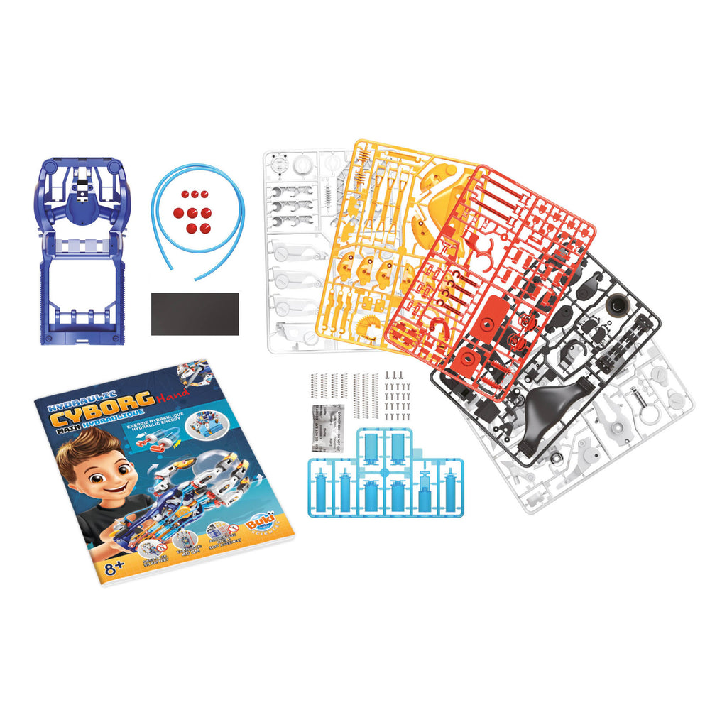 Construis une main cyborg articulée en assemblant les pièces. Ajoute de l'eau dans le système et pilote-la du bout des doigts. La main s'ajuste pour porter des objets comme des balles ou des bouteilles. Elle peut s'adapter aussi bien pour les droitiers que pour les gauchers.