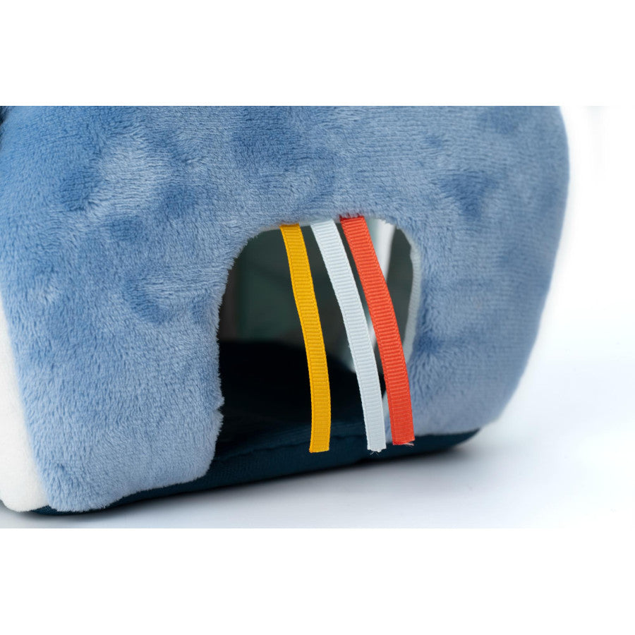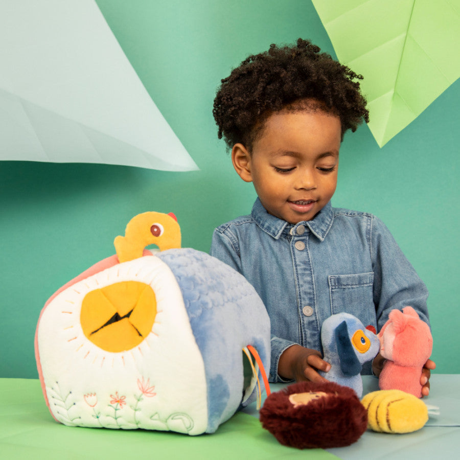 Cette maison en tissu et ses 4 hochets en peluche sont idéals pour éveiller les sens de bébé en douceur. C'est aussi un jeu d'encastrement tout doux, où chaque animal doit entrer dans la maison par l'ouverture qui lui correspond. De formes et couleurs différentes, nos amis animaux sont si agréables à câliner ! Que ça soit par une porte à rubans, un grand arbre ou un soleil brillant : tout le monde trouve sa place dans cette maisonnette en tissu !