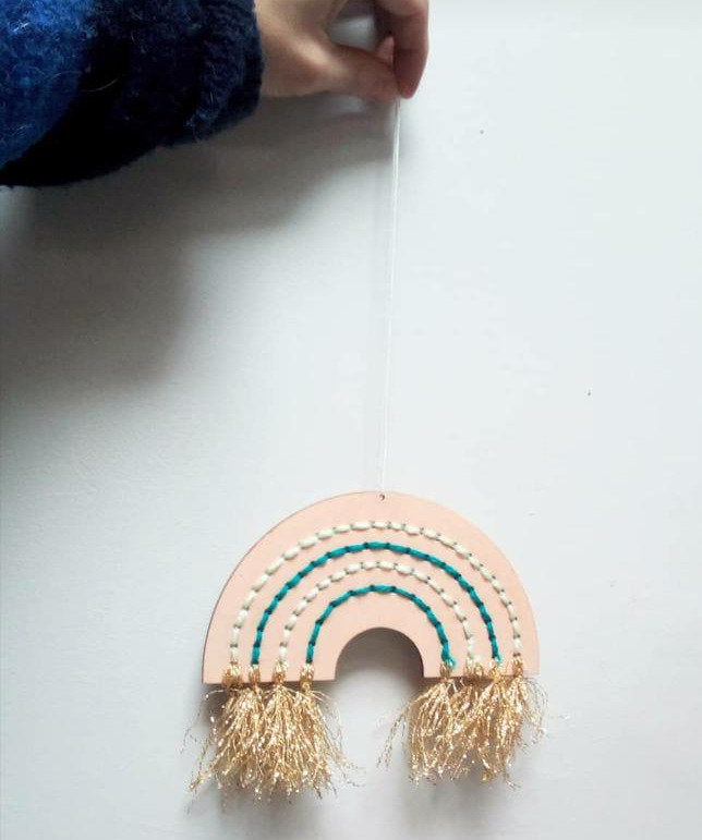 Un arc en ciel brut, en bois de bouleau, qui ne demande qu'à être coloré grâce aus fils de laine inclus, et l'aiguille.