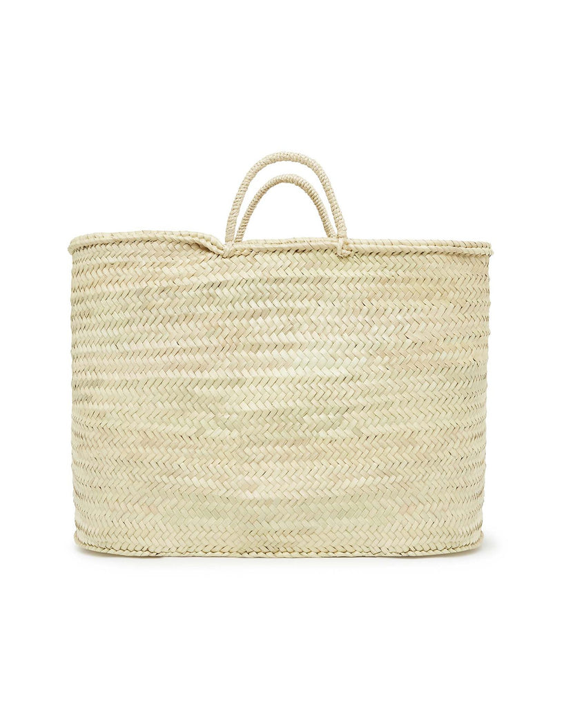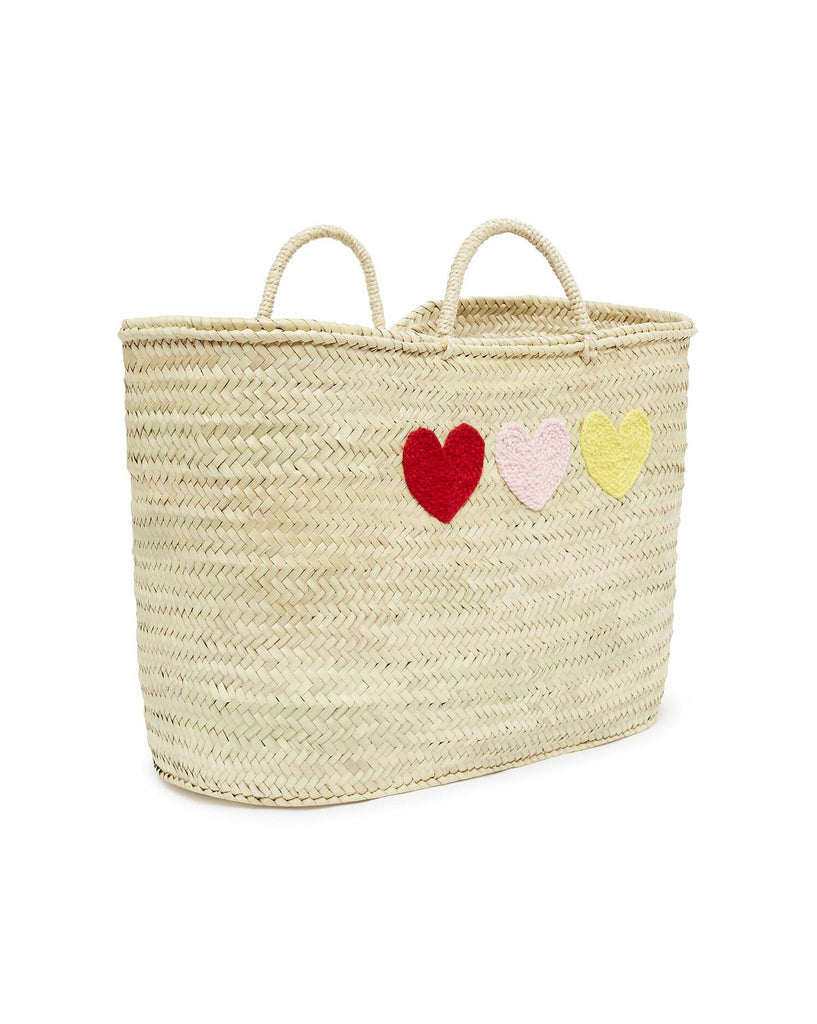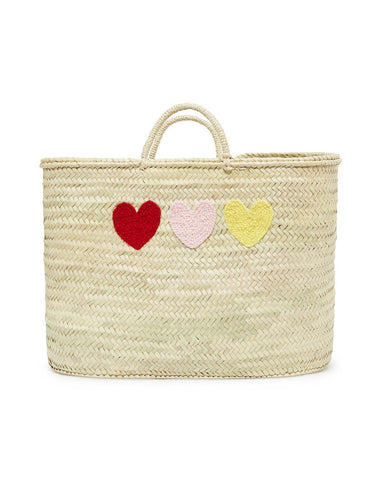Panier en osier avec trois coeurs, rouge, rose et jaune brodés. Idéal pour les courses, ranger les jouets ou aller à la plage !