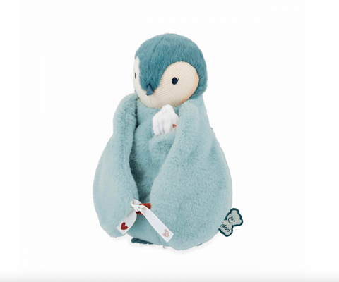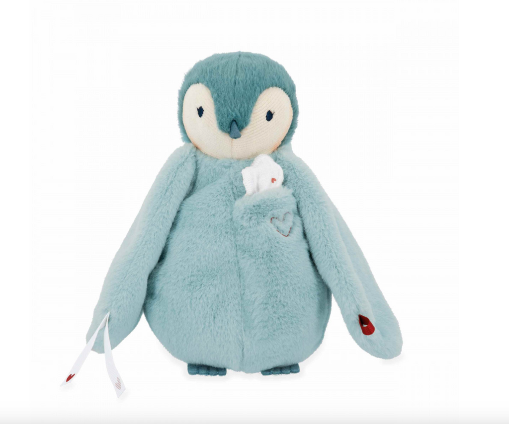 Ce manchot en peluche au ventre moelleux est accompagné de son mouchoir, idéal pour déposer des bisous ou l'odeur des parents et ainsi rassurer bébé, dès la naissance. Agréable à toucher et à câliner, ce doudou propose une petite poche facilement accessible sur le devant où est cousu un joli mouchoir en mousseline de coton. C'est une matière qui imprègne aisément les odeurs, ce qui permet au parent de garder le mouchoir près de lui avant de le glisser dans la peluche de bébé. Dès qu'un gros chagrin se fait sentir, la peluche à bisous sera là pour rassurer le tout-petit et lui rappeler le lien spécial qui l'unit à ses parents !