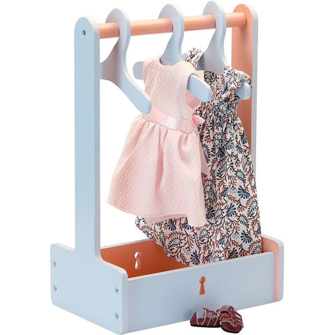 Penderie en bois peint bicouleur, pour les vêtements de poupées. Fournis avec 3 cintres. A monter soi-même. Vêtements non compris.