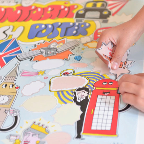 Voici une très jolie affiche pédagogique pour apprendre l'anglais, à compléter avec des autocollants repositionnables. L'enfant colle sur l'affiche environ 85 grands autocollants, qui représentent des mots et des expressions anglais. Un excellent moyen de mémoriser l'anglais tout en s'amusant ! Une magnifique affiche pour enfants, pleine de clins d'œil amusants à la culture britannique : reine d'Angleterre, drapeau anglais, bus londonien, pop stars célèbres…