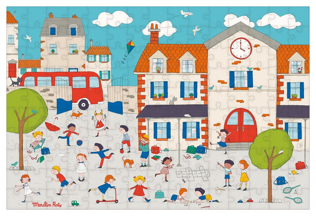 Un puzzle grand format de 150 pièces sur le thème de l’école représentant une jolie cour de récréation. Riche en couleurs et en détails, ce puzzle permettra à votre enfant de stimuler sa concentration.