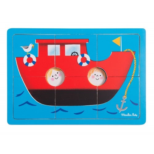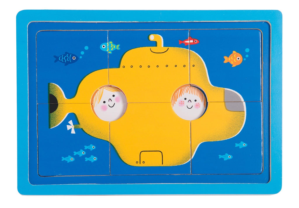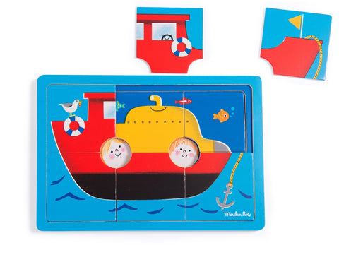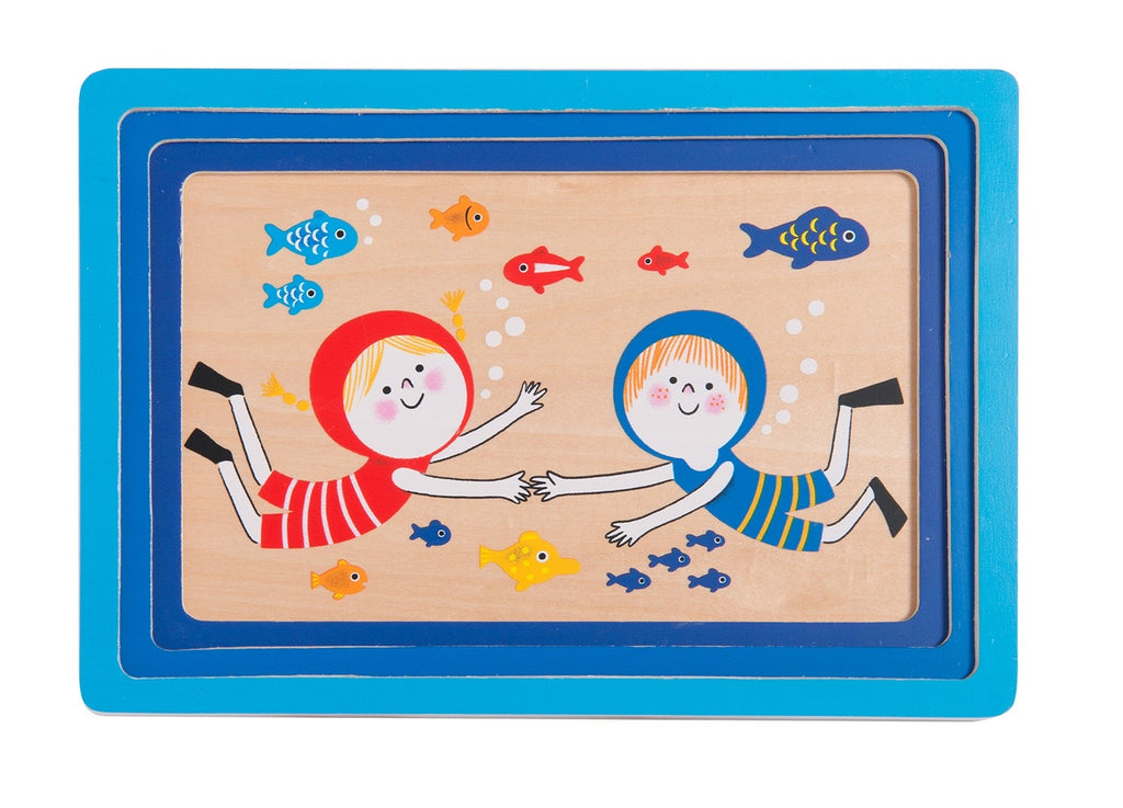 Un puzzle en bois qui se compose de 18 pièces se superposant sur 3 niveaux différents sur le thème de la mer. A partir de 2 ans