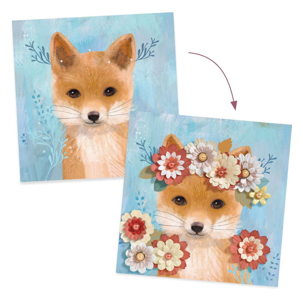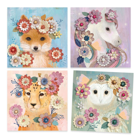Pour compléter les 4 tableaux, l’enfant dispose d’une multitude de corolles de papier, qu’il assemble facilement grâce aux jolies attaches parisiennes nacrées. De magnifiques couronnes de fleurs coiffent la tête des animaux.