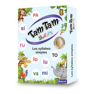 Tam Tam SAFARI - Les syllabes simples - niveaux MS - GS - CP Une jolie boite colorée avec les animaux du safari 2 séries de cartes Tam Tam : l’une avec les syllabes en lettres majuscules et l’autre avec les lettres minuscules scriptes.