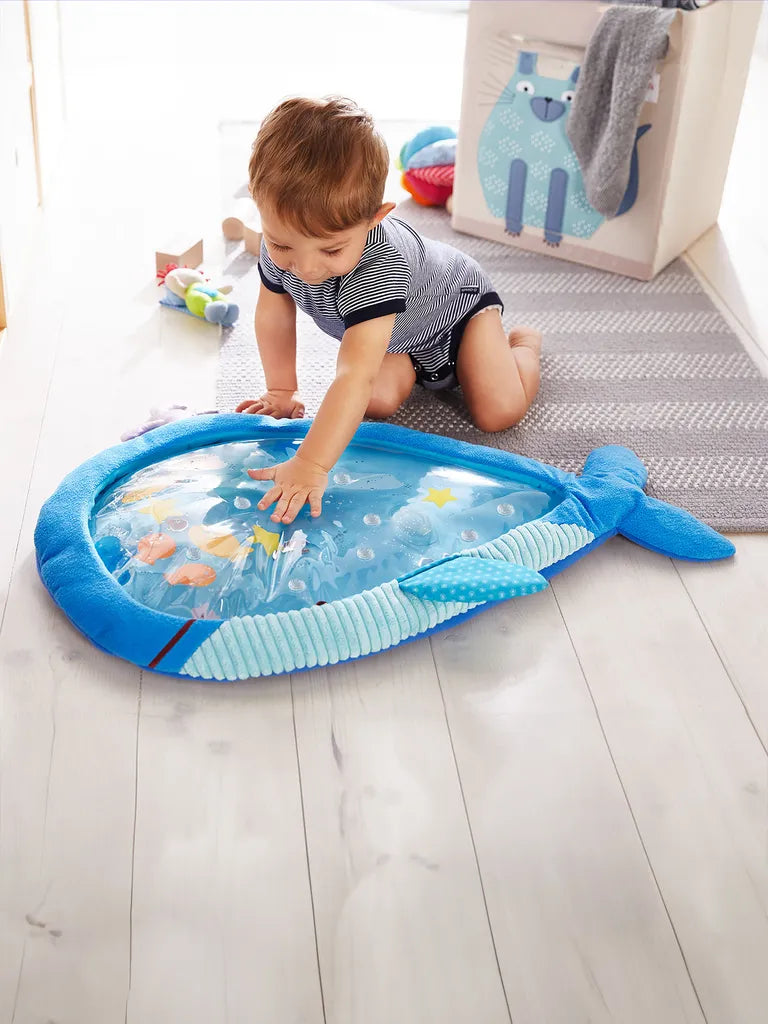 Découvrez le Tapis d'éveil aquatique Grande Baleine, un accessoire de développement conçu pour stimuler la curiosité des bébés dès 6 mois. Ce tapis innovant combine un cœur rempli d'eau avec une housse en tissu doux pour un confort optimal lors des séances de jeu sur le ventre. Les éléments aquatiques mobiles, l'anneau de dentition et les attaches latérales à effet papier froissé offrent une multitude de textures et de sensations à explorer. Parfait pour renforcer les capacités motrices tout en divertissant votre enfant, ce tapis transforme chaque moment de jeu en opportunité d'apprentissage sensoriel.